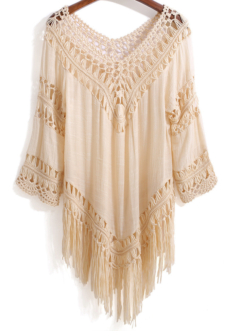 Ladies Cream Boho Crochet Fringe Blouse/Tunic